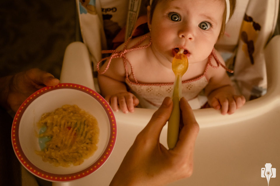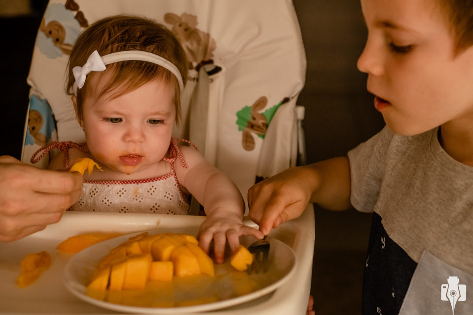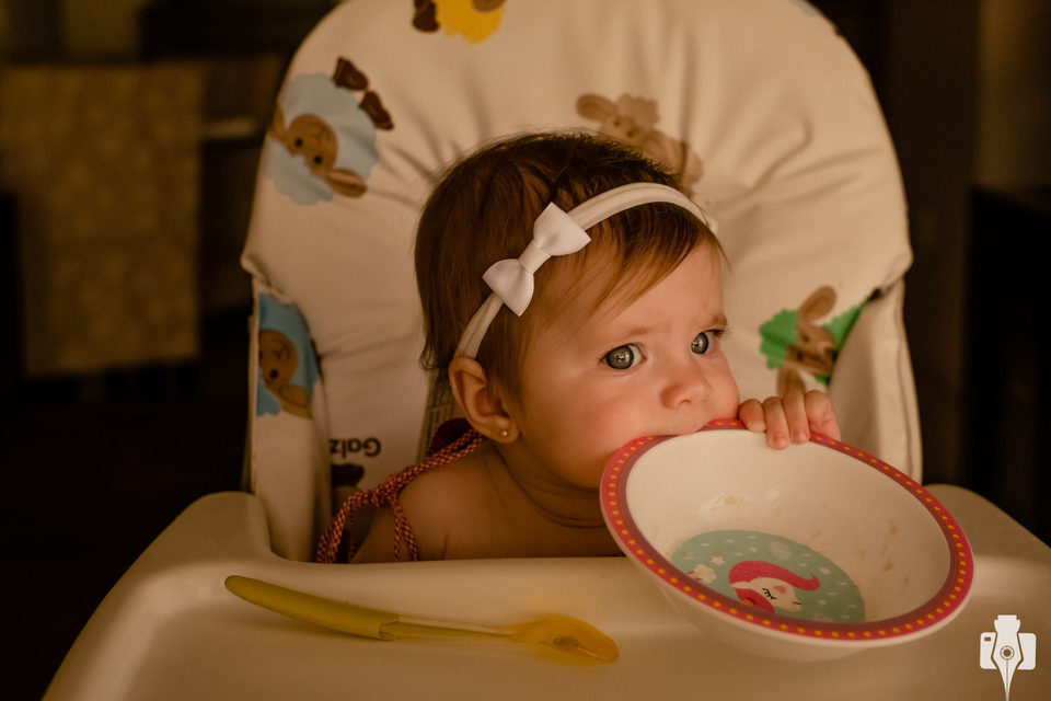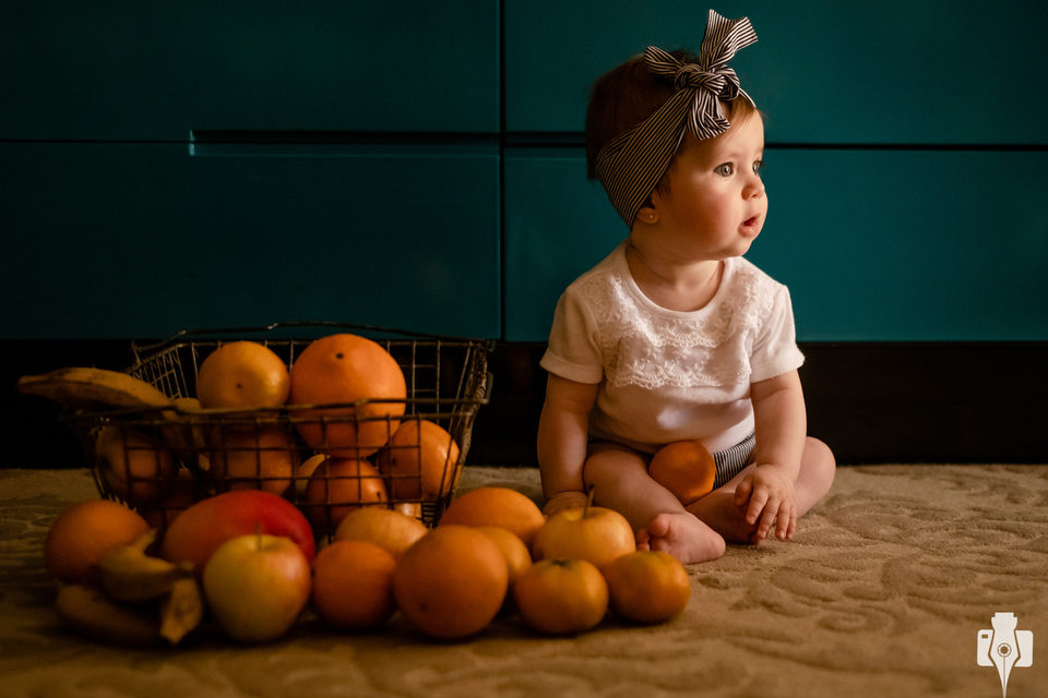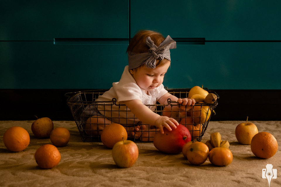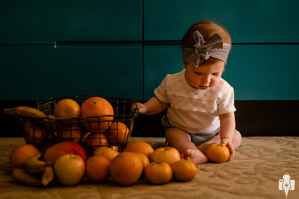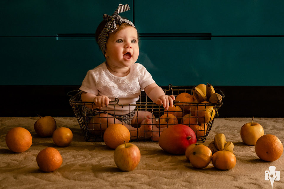 As fotos do acompanhamento de seis meses da Mariana ficaram lindas, em meio a salada de frutas que a mamãe Andiara arrumou.