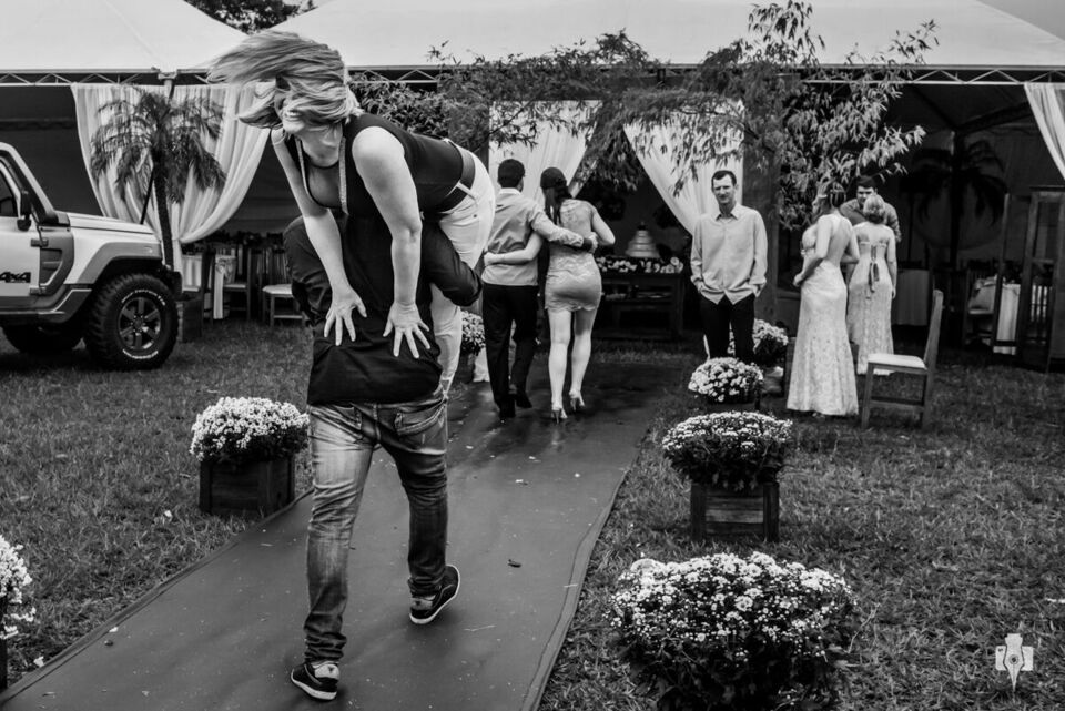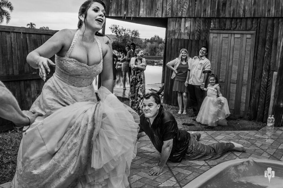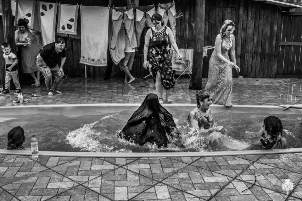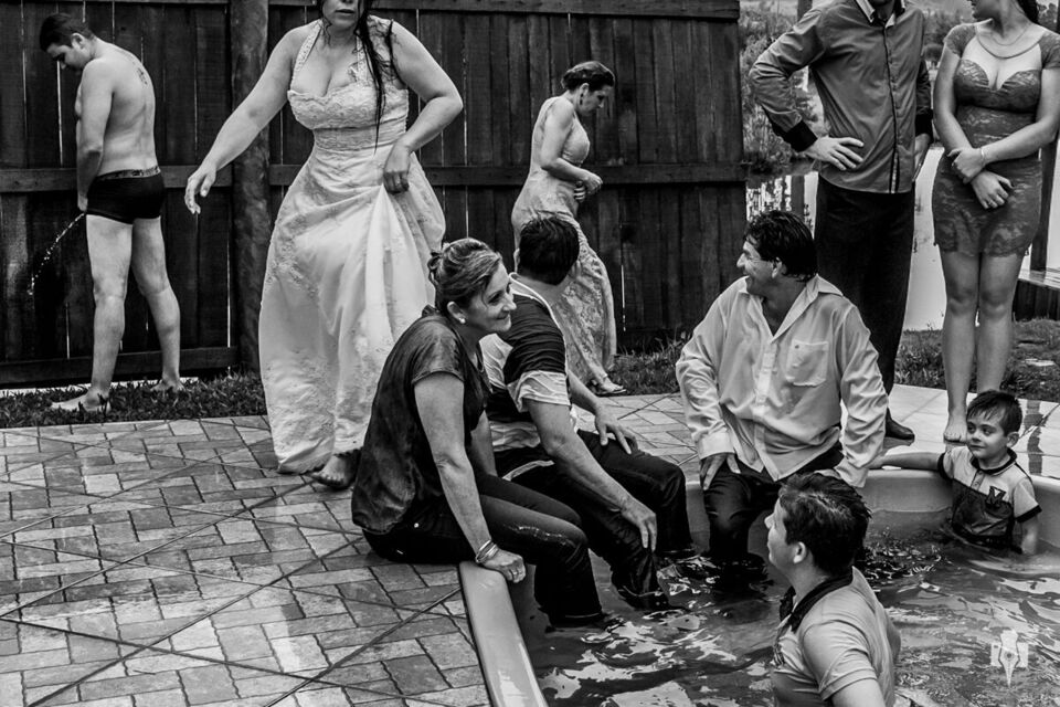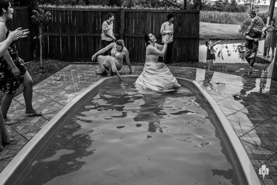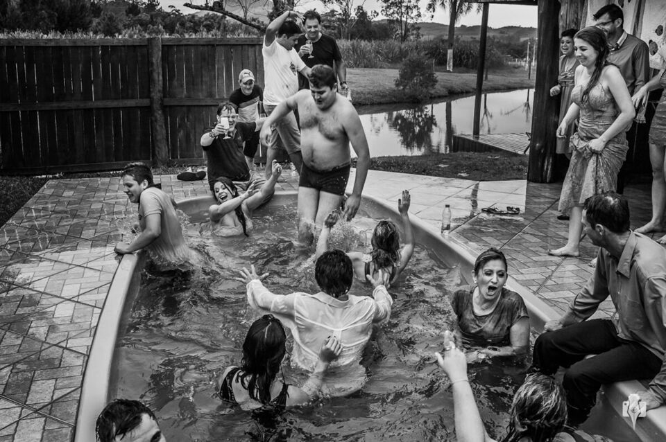 A festa foi muito divertida, cheia de carinho. Foram abraços e lágrimas pra todos os lados. E foi tanta animação que a festa acabou dentro da piscina, com roupa de festa e tudo, uma alegria sem igual.