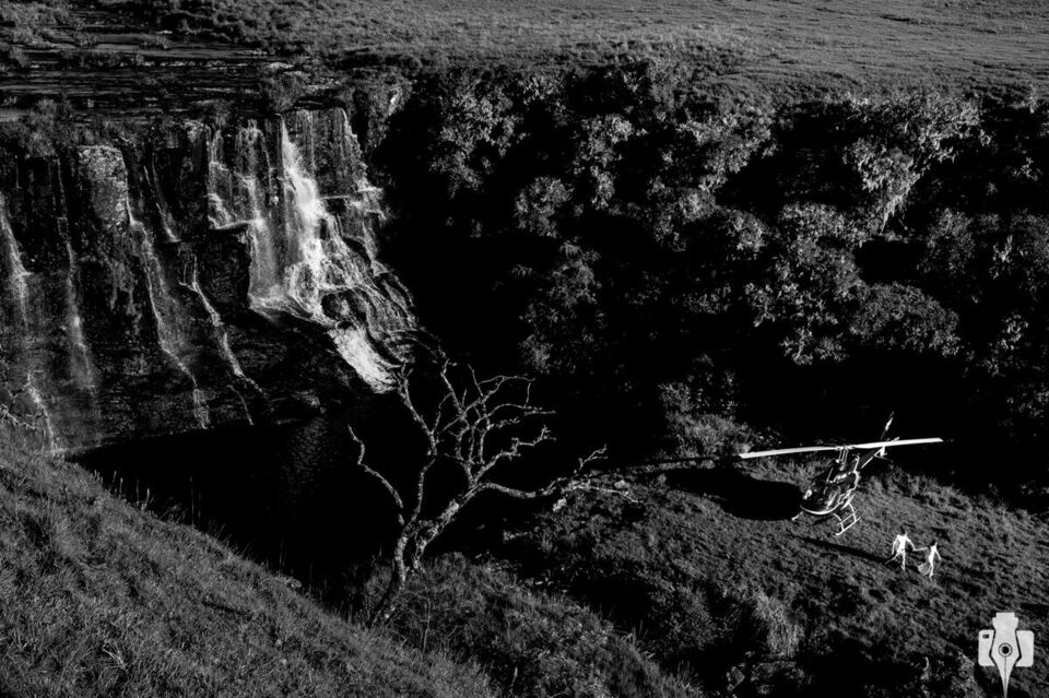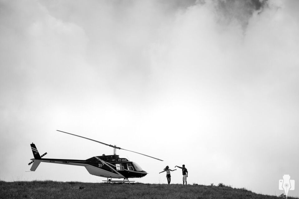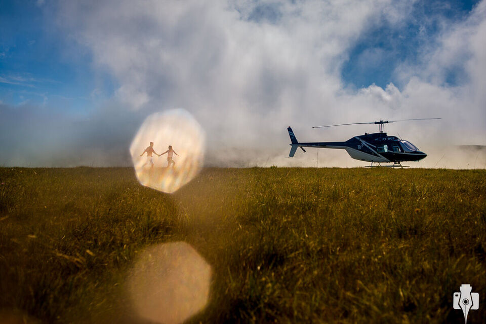 Poucos meses depois havia um pedido de orçamento para casamento em Gramado, e eis que o noivo se identificou como o piloto daquela imagem! Depois da nossa primeira conversa é claro que já começamos os planos para um ensaio fotográfico que não só incluiria o helicóptero, como também seria num local com acesso somente pelo ar (ou a cavalo).